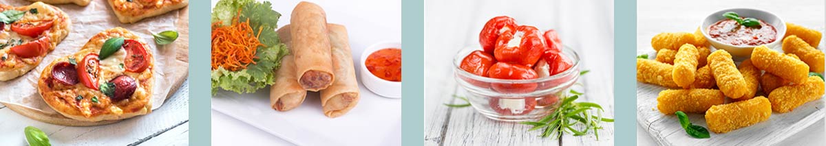 Pizzette Bocconcini di pollo impanati Ali di pollo Mozzarella bastoncini impianti Coda di gambero involto in patate Gamberi in tempura di zenzero e sesamo Kibbeling (filletto di nasello) nel impasto Involtini